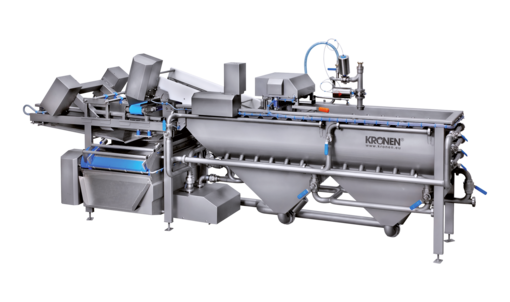 Die Maschine ist standardmäßig mit einer Verriegelung ausgestattet, die es ermöglicht, sie mit den blauen KRONEN-Schleuderkörben auf einem Wagen zu verwenden. So wird eine einfache und saubere Handhabung der Produktion kleinerer Chargen gewährleistet, das Verschütten von Produkt verhindert und ein sicherer Betrieb ermöglicht, wodurch Kosten gespart werden.