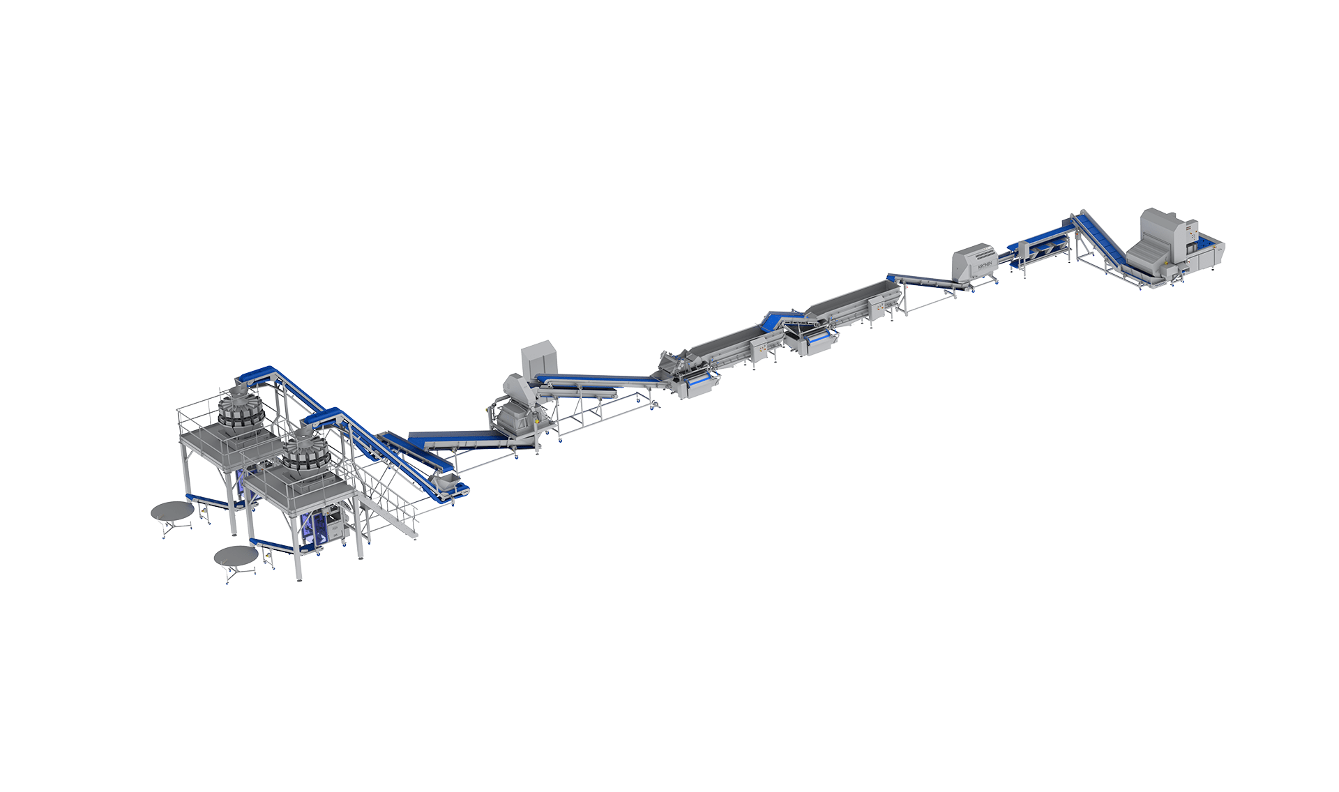 Línea procesadora y de envasado de lechugas y hortalizas de KRONEN para hasta 2,5 t/h: instalación automática completa para descorazonar, cortar, lavar, secar, pesar y envasar lechugas y hortalizas