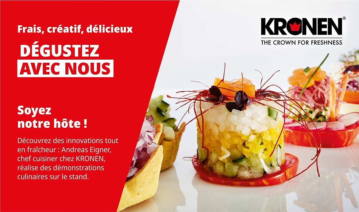 Comme c’est la tradition chez KRONEN, les machines fonctionneront en continu et pourront être observées en pleine action. La visite sera agrémentée de petites dégustations culinaires concoctées par le chef cuisinier de KRONEN.