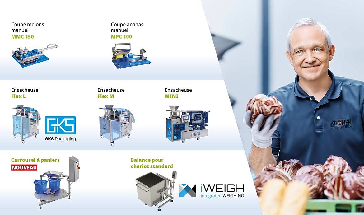 L'offre est complétée par les solutions de pesage de la société iWEIGH, présente pour la première fois sur le stand de KRONEN. Une nouvelle balance pour chariot standard (Eurobin), destinée aux processus combinés de pesage et d’emballage, ainsi qu'une balance de table pour un portionnement précis seront présentées.